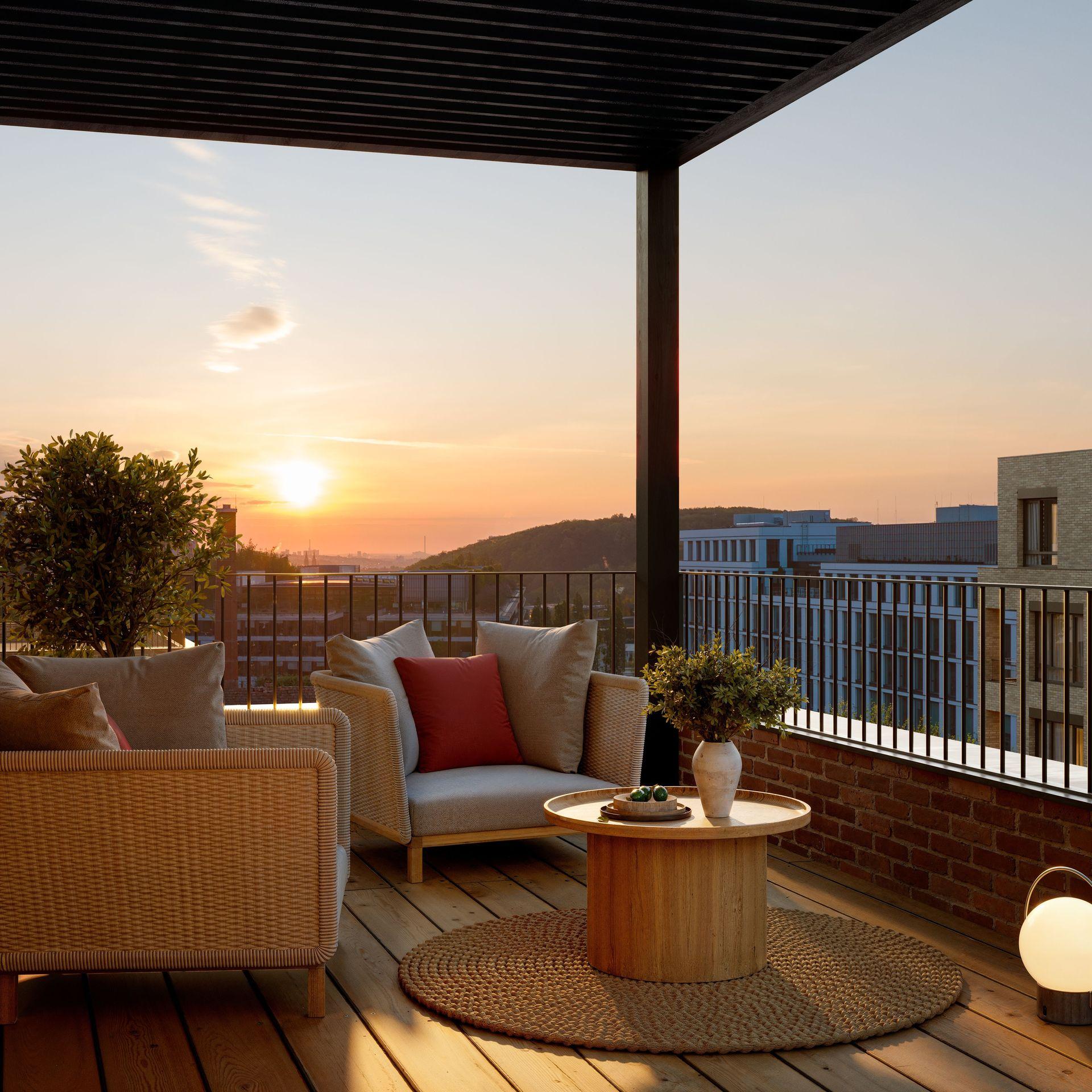 | Více+ | Většina bytů má vlastní terasu, lodžii nebo předzahrádku, podzemní parkovací stání a v domech jsou sklepní kóje či prostor pro mytí kol, kočárků i zvířecích mazlíčků. Dokončení bytů v etapě F: Q1 2027. |